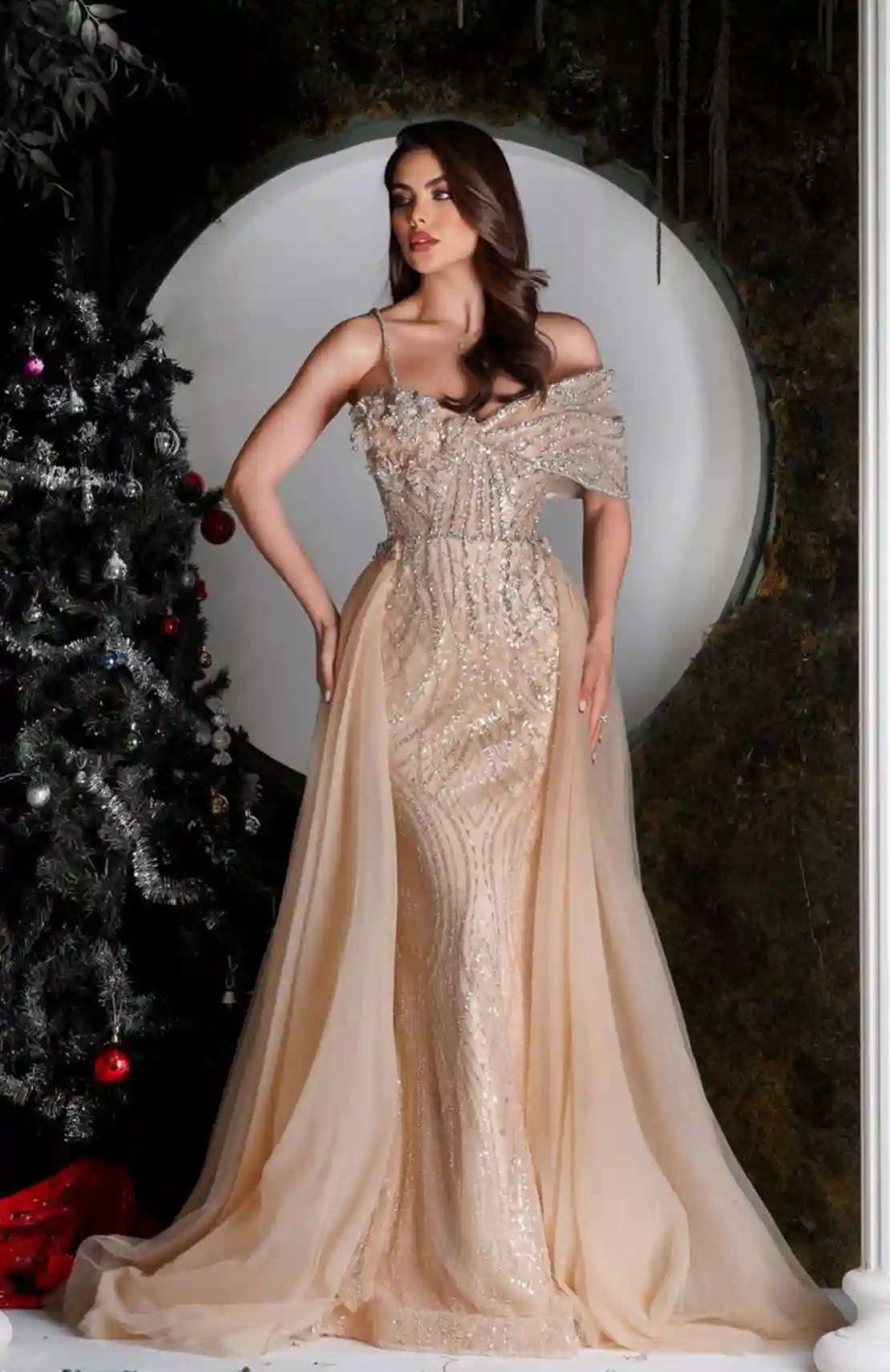 Mermaid embellished with handcrafted beading, featuring a removable tulle train for two stunning looks in one — timeless elegance, redefined. 💫