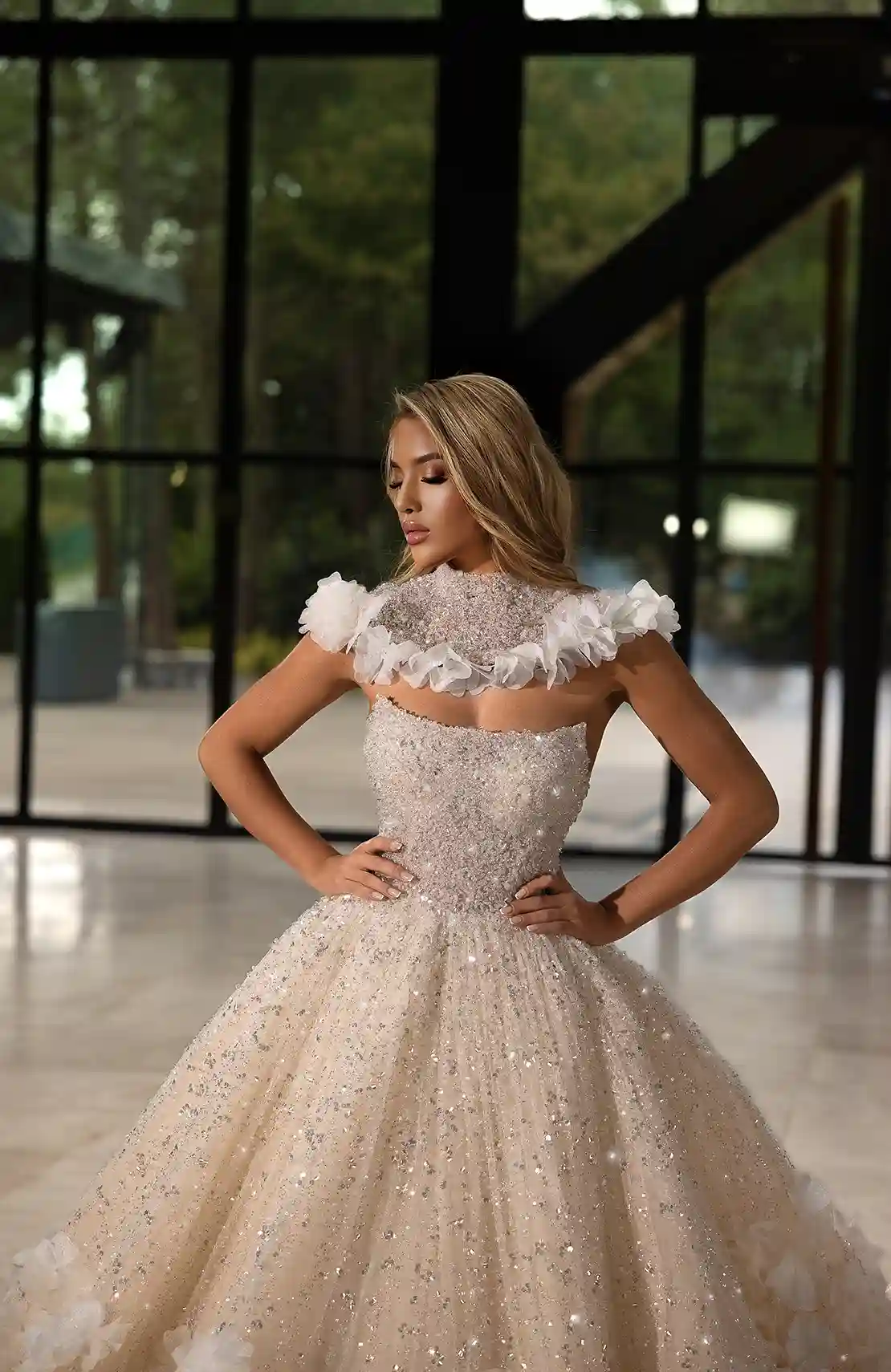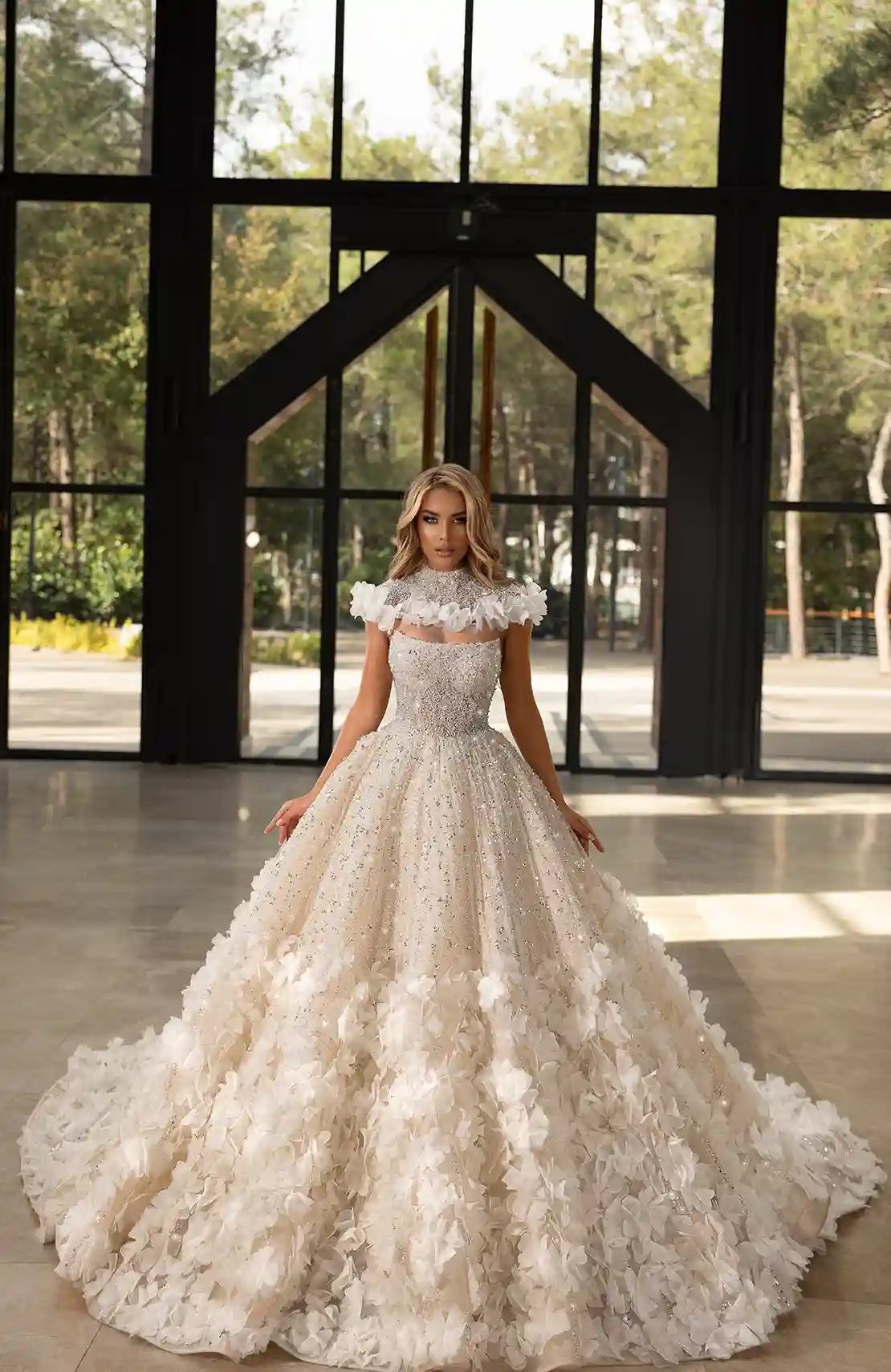 A princess-style gown adorned with handcrafted crystal embellishments, featuring a flowers design that flows from the mid-skirt to the hem. It includes a detachable piece that covers the neck and shoulders, allowing you to remove it whenever you wish — giving you two enchanting looks on your wedding day.