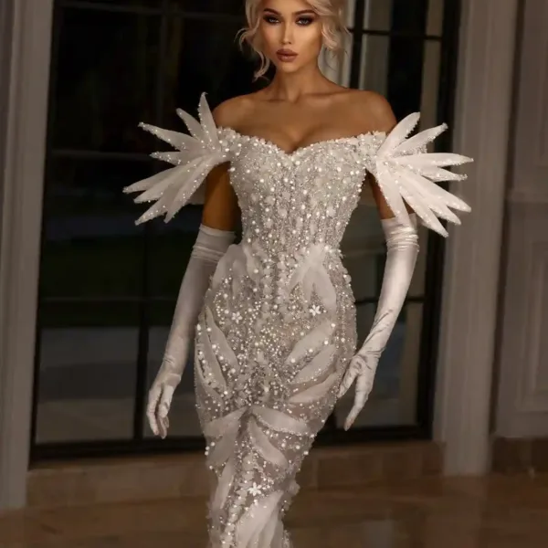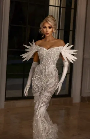 A fishtail dress embellished with roses and 3D crystals. Off-shoulder at the waist that can be worn or removed, giving you tow different and charming looks.