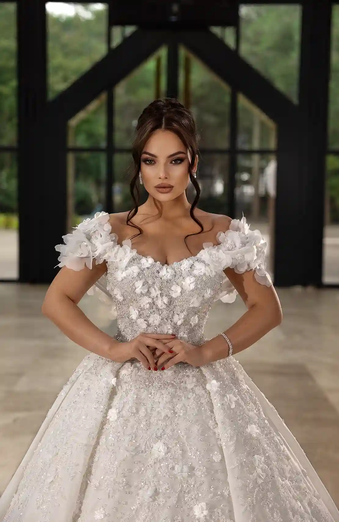 A rose-inspired princess gown with a voluminous off-shoulder design, covered in exquisite 3D floral details cascading from the shoulders to the hem. The dress is adorned with rich hand embroidery, creating a luxurious and irresistibly romantic look.